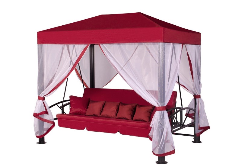 Данный комплект, состоящий из подушек и тента предназначен для качелей-беседки, данный комплект выполнен в красном цвете. Для изготовления данного комплекта использовалось полиэфирное волокно, а в качестве наполнителя использовался халкон. В комплекте находится матрас, размер которого составляет 190х8х120 см, декоративная подушка размером 40 на 40 см, их в комплекте четыре штуки. Также в нем находятся две декоративные подушки размером 50 на 50 см, тент и москитная сетка.